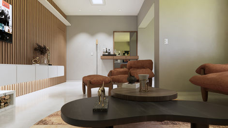 O mobiliário, com peças assinadas pelo renomado designer brasileiro Sérgio Rodrigues, como o sofá e as poltronas, acrescenta um toque de sofisticação e valoriza as raízes da arquitetura nacional. A combinação entre linhas contemporâneas, materiais naturais e soluções inteligentes resulta em um ambiente acolhedor, discreto e atemporal.