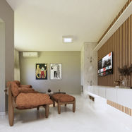 Integrada a uma residência de campo já existente, esta sala de estar foi reformulada para se adequar ao novo estilo de vida dos moradores, mantendo o conforto e a identidade original da casa. O painel ripado é um dos elementos centrais do projeto: além de compor a decoração com elegância, ele esconde de forma sutil uma porta que dá acesso às outras áreas da residência, equilibrando estética e funcionalidade.