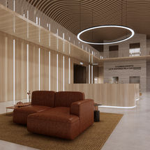 Criado para proporcionar conforto e bem-estar. A luz natural que atravessa as amplas janelas de vidro do Hall B12 valoriza os tons suaves da madeira clara, transmitindo uma sensação de leveza e tranquilidade. No centro, o sofá de couro marrom adiciona um toque de sofisticação e aconchego, convidando ao descanso e à convivência. Um espaço pensado para receber, inspirar e tornar os momentos do dia a dia mais agradáveis e especiais.