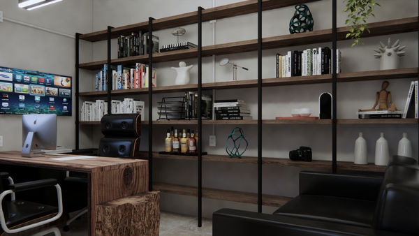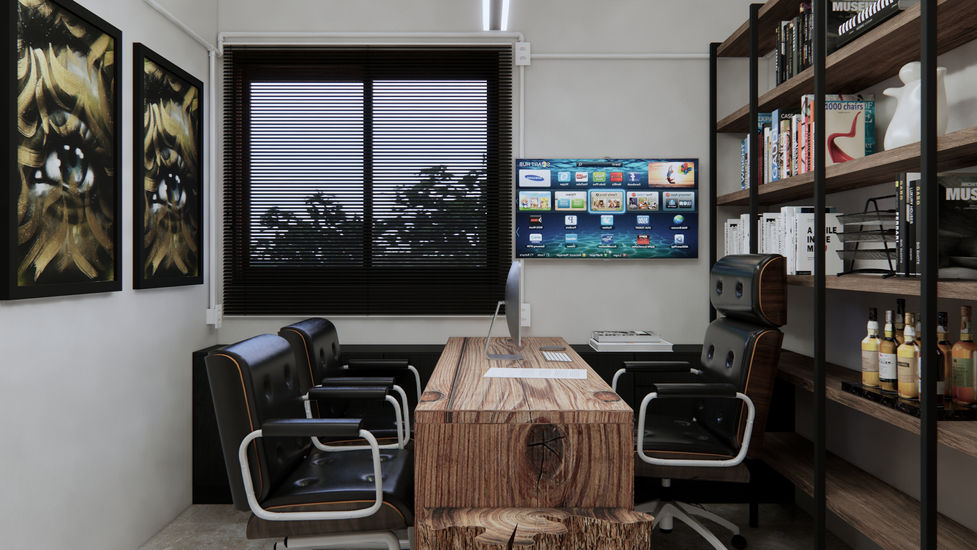 A história do cliente ganhou forma neste projeto. As madeiras já existentes foram cuidadosamente trabalhadas para dar vida à imponente mesa de trabalho e às prateleiras. O contraste entre o rústico e o moderno se revela nos detalhes, com estantes metálicas e poltronas de couro, criando um ambiente sofisticado e atemporal.